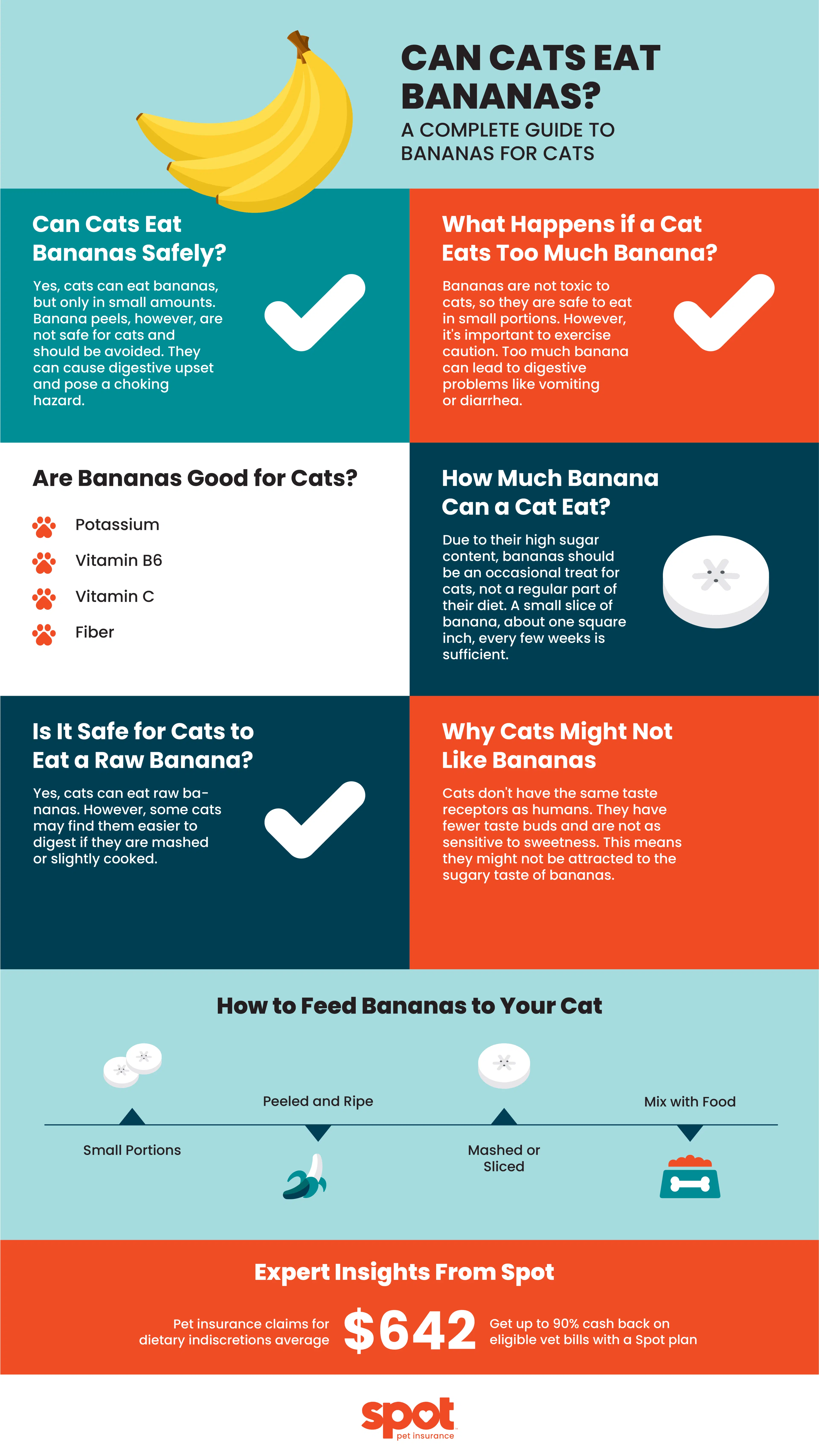 Bananas are not toxic to cats, so they are considered safe to eat in small portions. However, it's important to exercise caution. Too much banana can lead to digestive problems like vomiting or diarrhea.2 Always supervise your cat when offering any new food, including bananas.