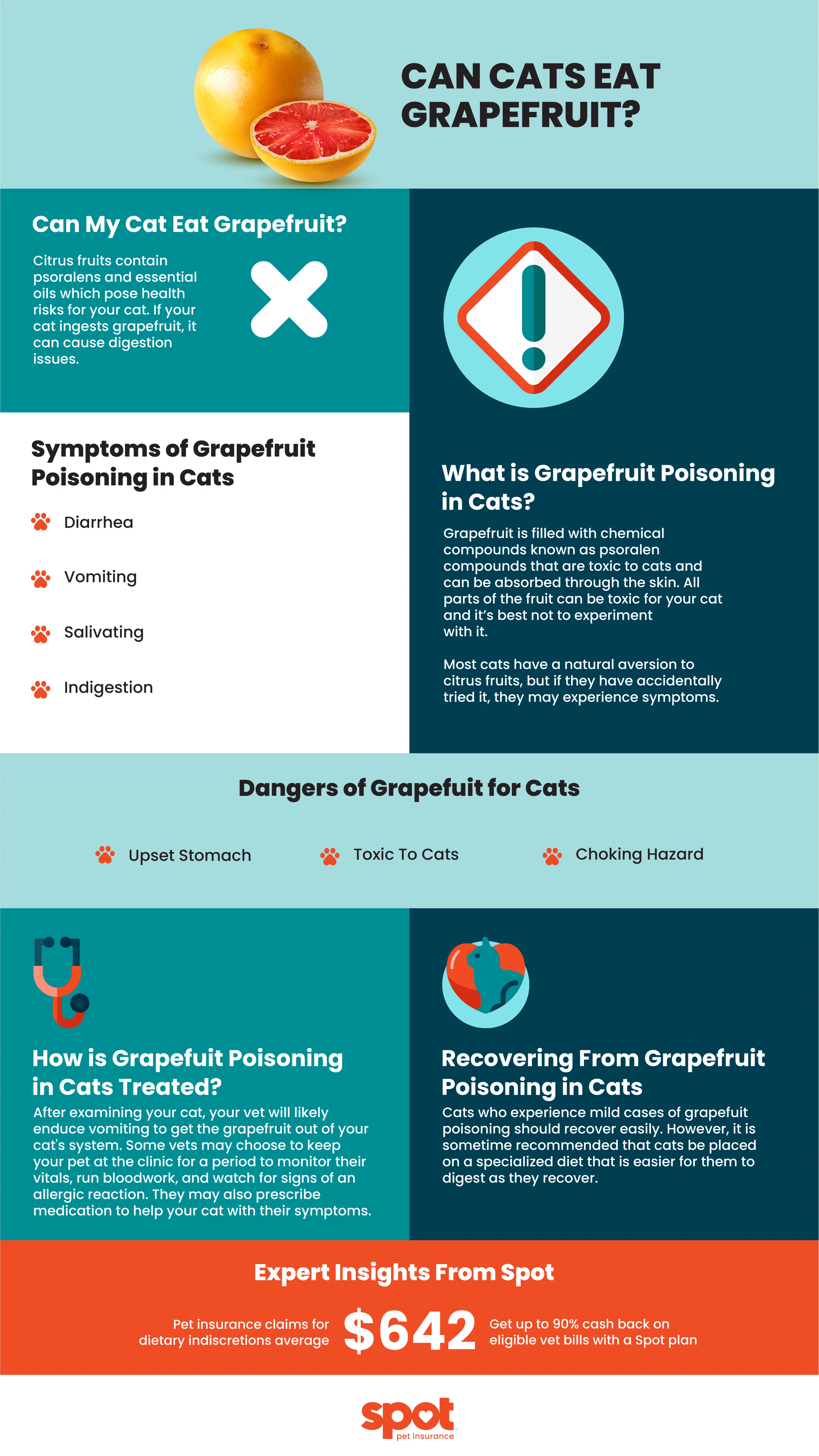 Citrus fruits contain psoralens and essential oils which pose health risks for your cat.1 If your cat ingests grapefruit, it can cause digestion issues. Cats have a natural aversion and sensitivity to the smell and taste of citrus so they may not be inclined to taste it anyway. However, if your cat has accidentally eaten grapefruit, they may be at risk of grapefruit poisoning.2