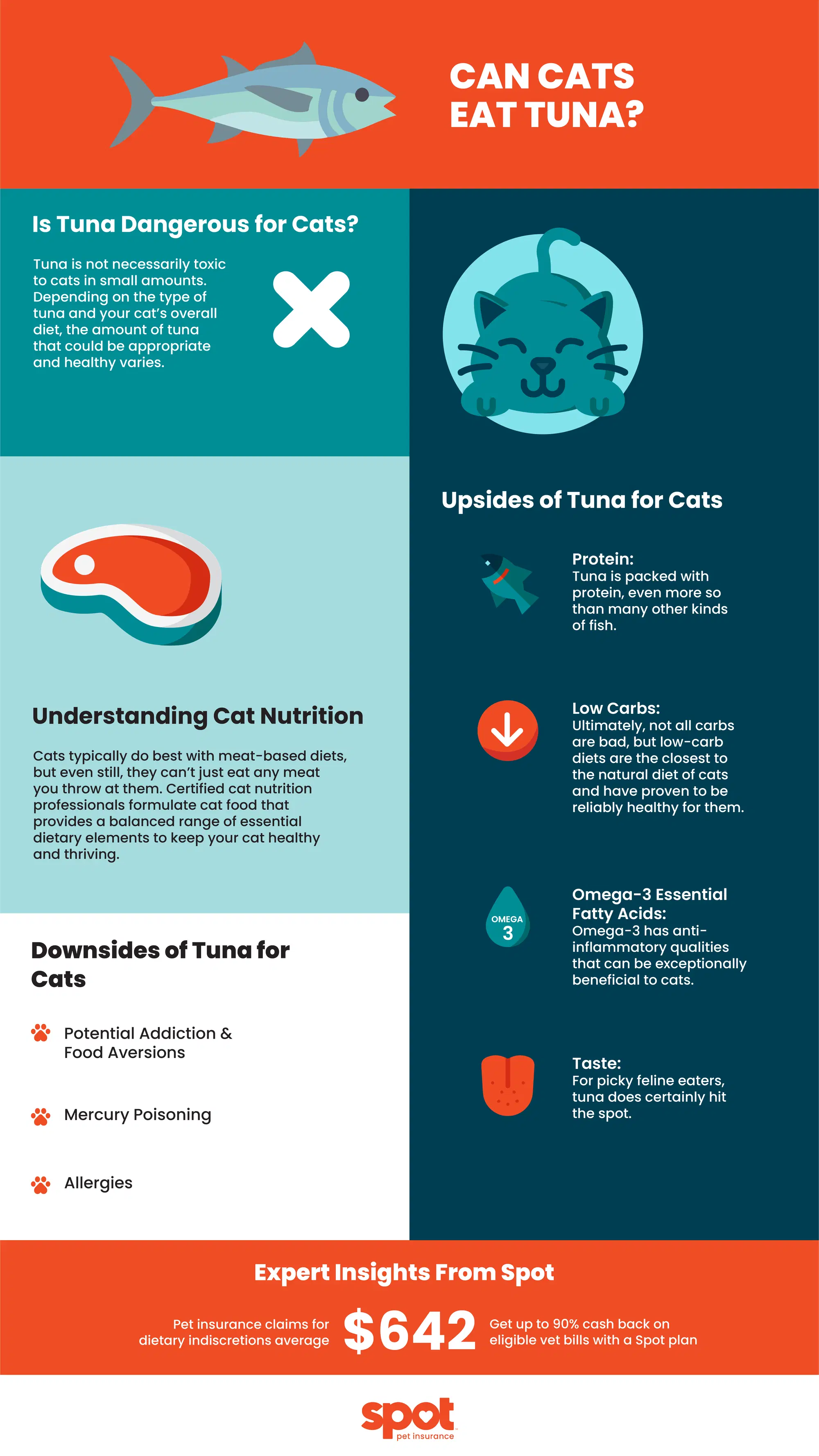 Unfortunately, feeding a cat tuna also has some downsides. Today, Spot Pet Insurance is here to help you understand whether it’s safe and healthy for cats to eat tuna. We’re talking you through the pros and cons of tuna as cat food and a few caveats you need to keep in mind.