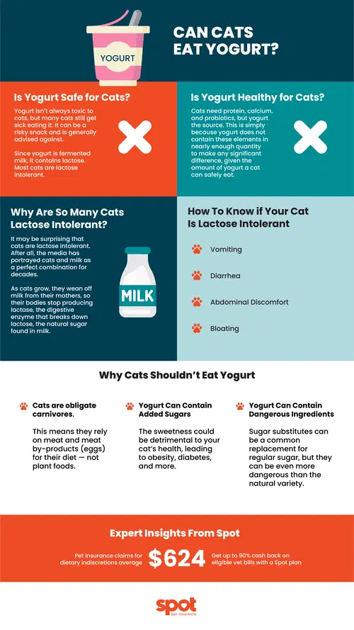 Yogurt isn’t always toxic to cats, but many cats still get sick eating it. It can be a risky snack and is generally advised against.3