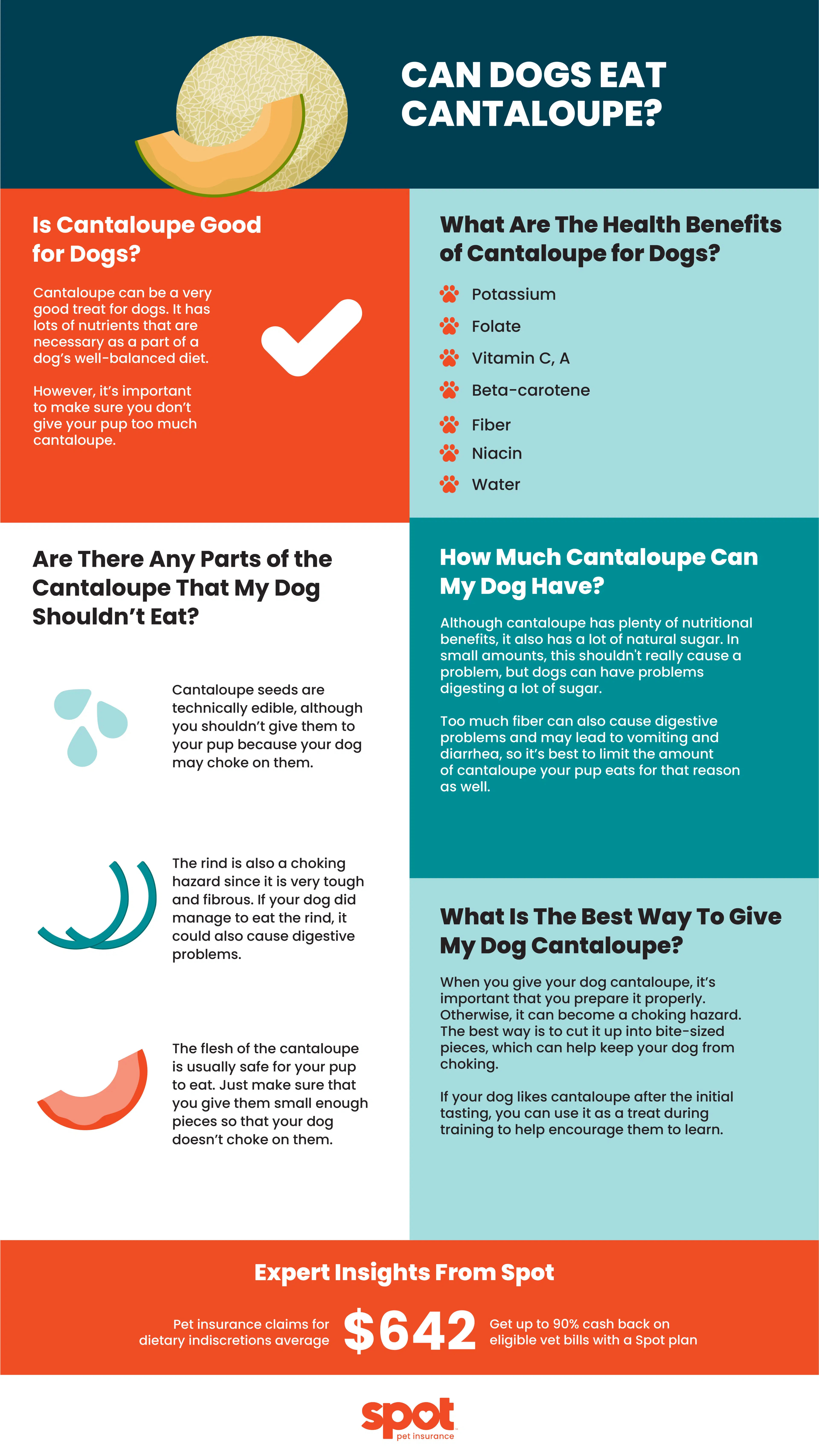 Cantaloupe can be a great treat in small doses, but too much can cause digestive issues, especially since dogs can have trouble digesting sugar.2