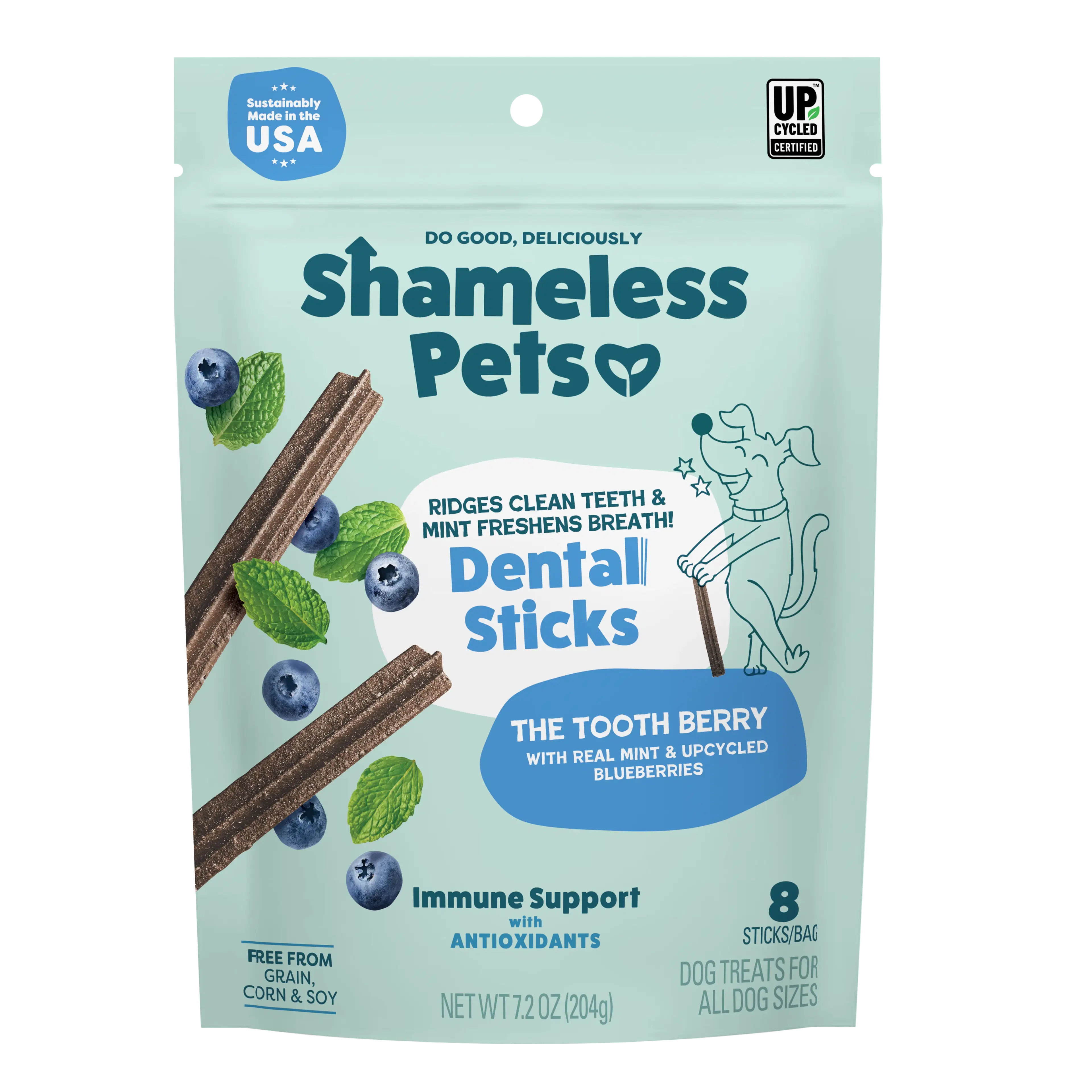 Shameless Pets Tooth Berry Dental Sticks are made to help support oral health while giving your dog a treat they’ll enjoy. These dental sticks also include antioxidants for immune support, adding even more everyday value. Plus, like all featured Shameless Pets products, they’re grain-, corn-, and soy-free and made for dogs of all sizes.